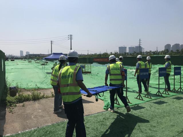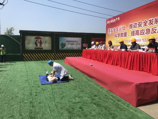 本次應(yīng)急救援演練由河西集團(tuán)新城公司承辦。模擬事故發(fā)生后,班組負(fù)責(zé)人向項(xiàng)目安全部匯報(bào)。項(xiàng)目經(jīng)理立即聯(lián)系附近雙閘街道衛(wèi)生院請(qǐng)求醫(yī)護(hù)救援,組織應(yīng)急救援工作,向監(jiān)理及甲方主要領(lǐng)導(dǎo)報(bào)告事故發(fā)生情況。隨后,有關(guān)人員及隊(duì)伍按照現(xiàn)場(chǎng)救援指揮部的指示及《高溫中暑應(yīng)急救援預(yù)案》的要求開(kāi)展救援及善后工作。