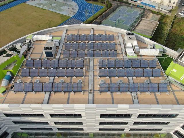 ——室外運(yùn)動場雨棚屋面由太陽能光伏發(fā)電板組成,既能夠發(fā)電也能夠遮風(fēng)擋雨。部分屋面也建有真空管太陽能熱水系統(tǒng),太陽能熱水可供廚房使用。