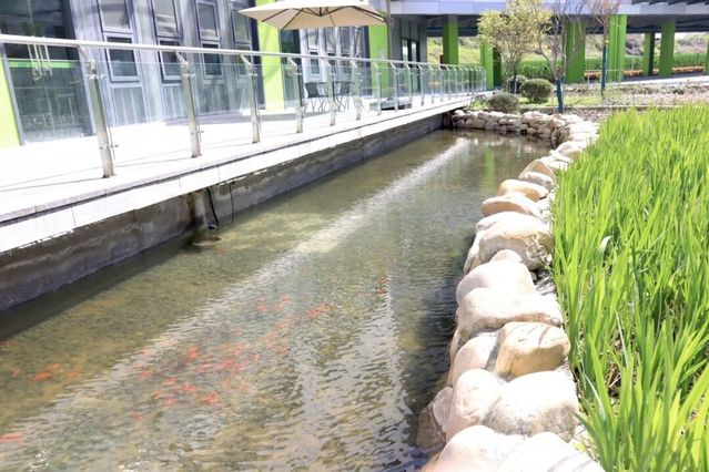 ——教學(xué)樓周邊利用雨水回收系統(tǒng),建有下凹式綠地和景觀魚池,既實(shí)現(xiàn)了循環(huán)利用雨水的環(huán)保功能,更是孩子們課間休息玩耍、做科學(xué)實(shí)踐活動的好去處。