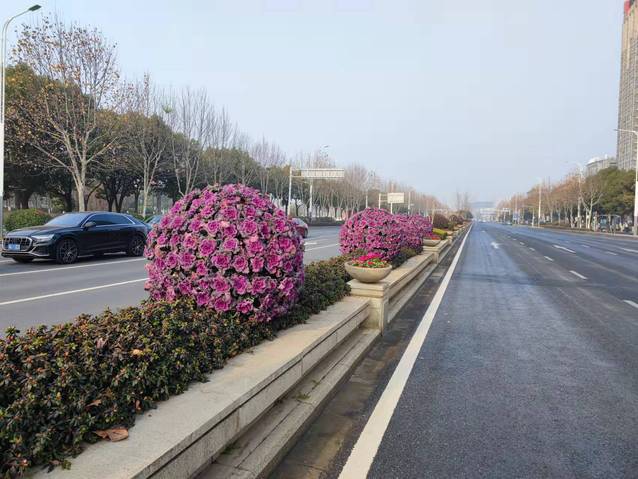 江蘇大劇院水韻路中分帶的花球也換上了“新裝”。10個巨大的羽衣甘藍花球被粉色的報春花和紅黃顏色角堇組成的花帶簇擁著,與兩邊的直線橙色花邊、方形花卉矩陣、流線型花帶一起構(gòu)成了一幅色彩斑斕、氣勢恢宏的絢麗畫卷,不但為兩會烘托出莊嚴隆重的氛圍,也洋溢著春節(jié)喜慶的氣氛。