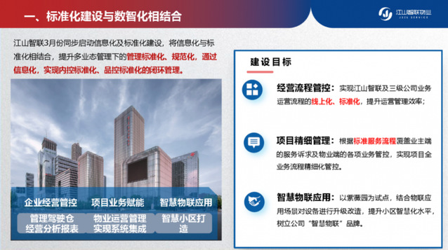 會上,設(shè)計成本部匯報了集團各公司標準化工作整體推進情況,奧體公司、新城公司、園林公司、青奧城公司、江山智聯(lián)物業(yè)公司、濱江公園公司分別展示了最新的標準化工作成果。各公司標準化的工作緊緊圍繞其主營業(yè)務(wù)展開,貼合自身需求,特色鮮明。