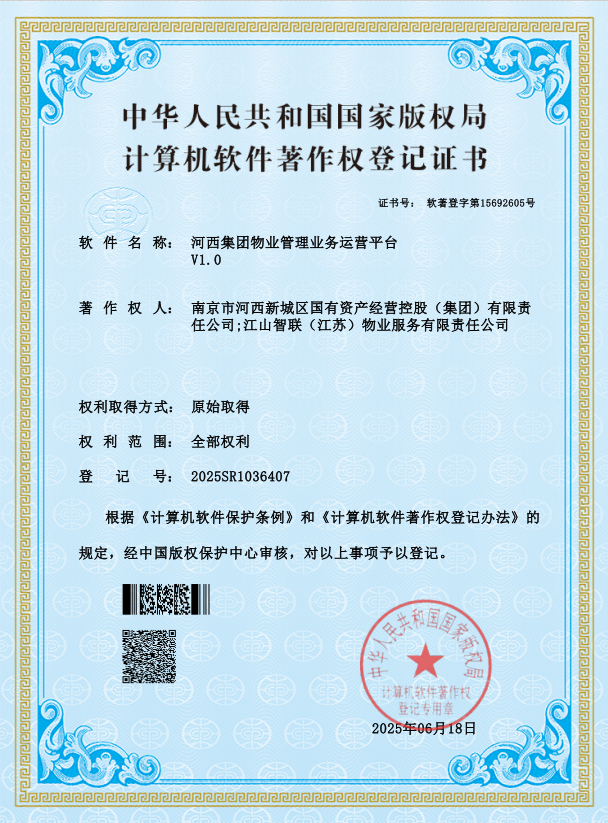 近日,河西集團物業(yè)管理業(yè)務運營平臺成功獲得中華人民共和國國家版權局頒發(fā)的《計算機軟件著作權登記證書》。